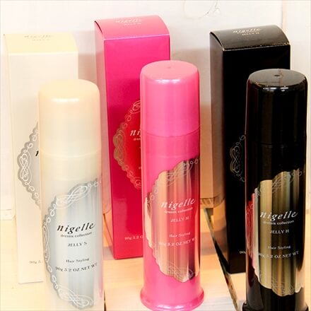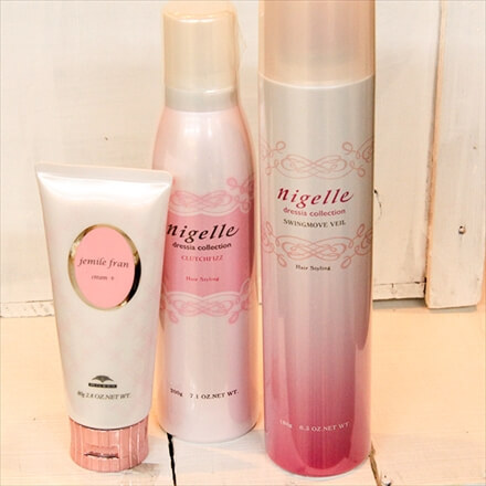 【ジェミールフラン】 左から、クリーム・ムース・スプレー。香りが良く、女性に人気のスタイリング剤です。